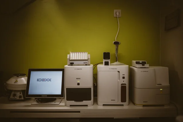 Wij beschikken over onze eigen apparatuur voor de analyse van bloed, urine en andere stalen. Hierdoor hoef je niet meer te wachten op de resultaten van een extern labo en kunnen we het dier sneller behandelen.